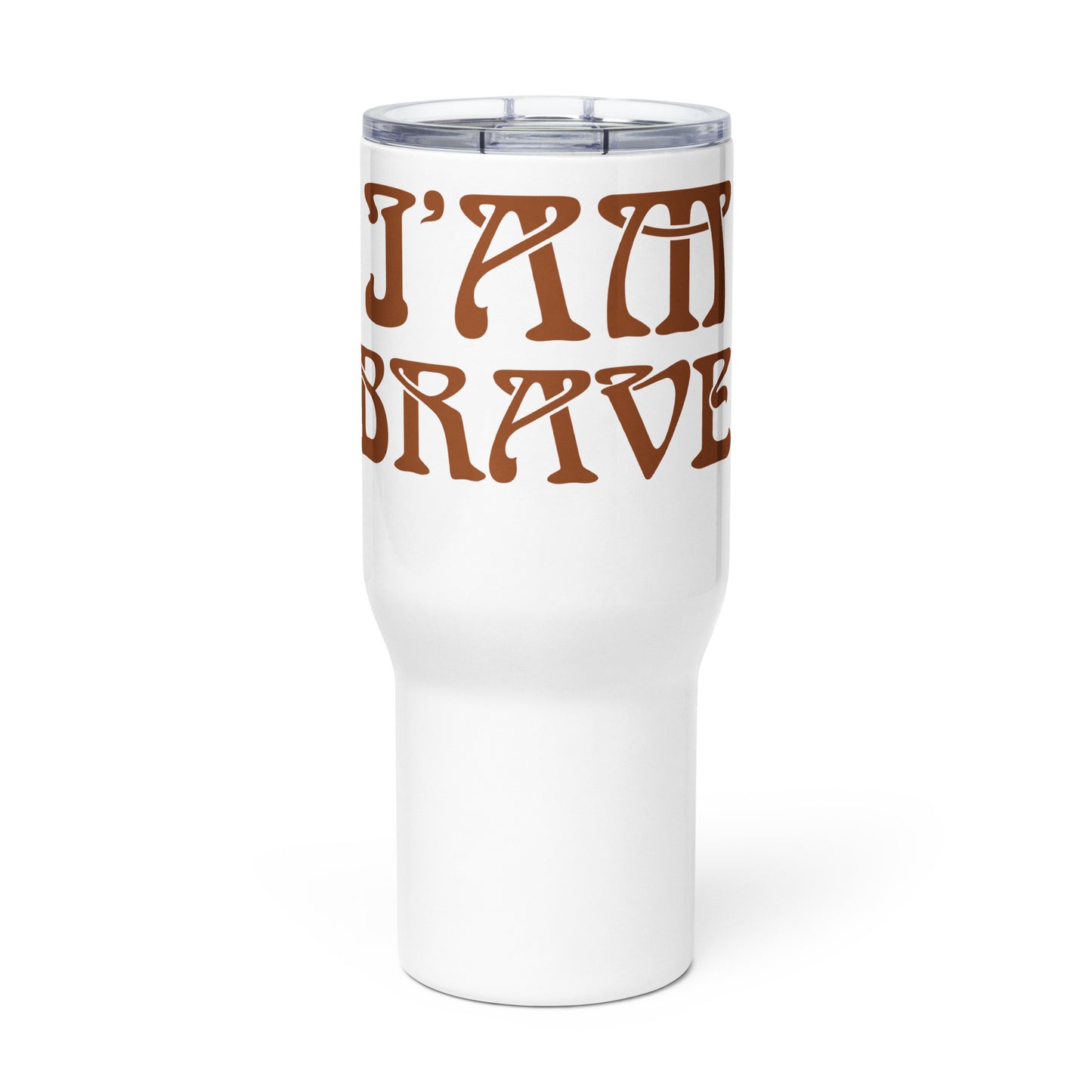 “I’AM BRAVE!” White Travel Mug W/Saddle Brown Font