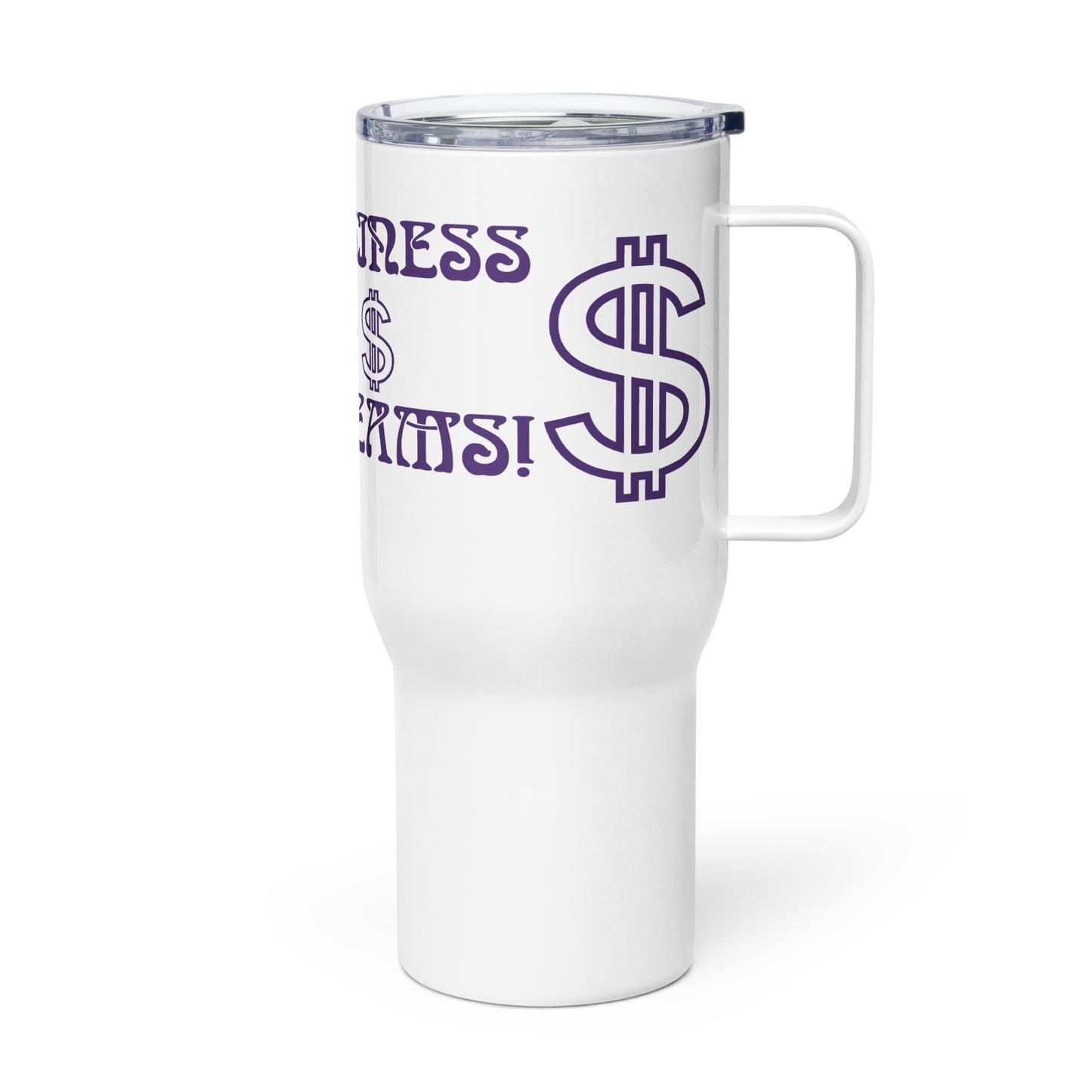 “BIG BUSINESS & BIG DREAMS!”White Travel Mug W/Purple Font