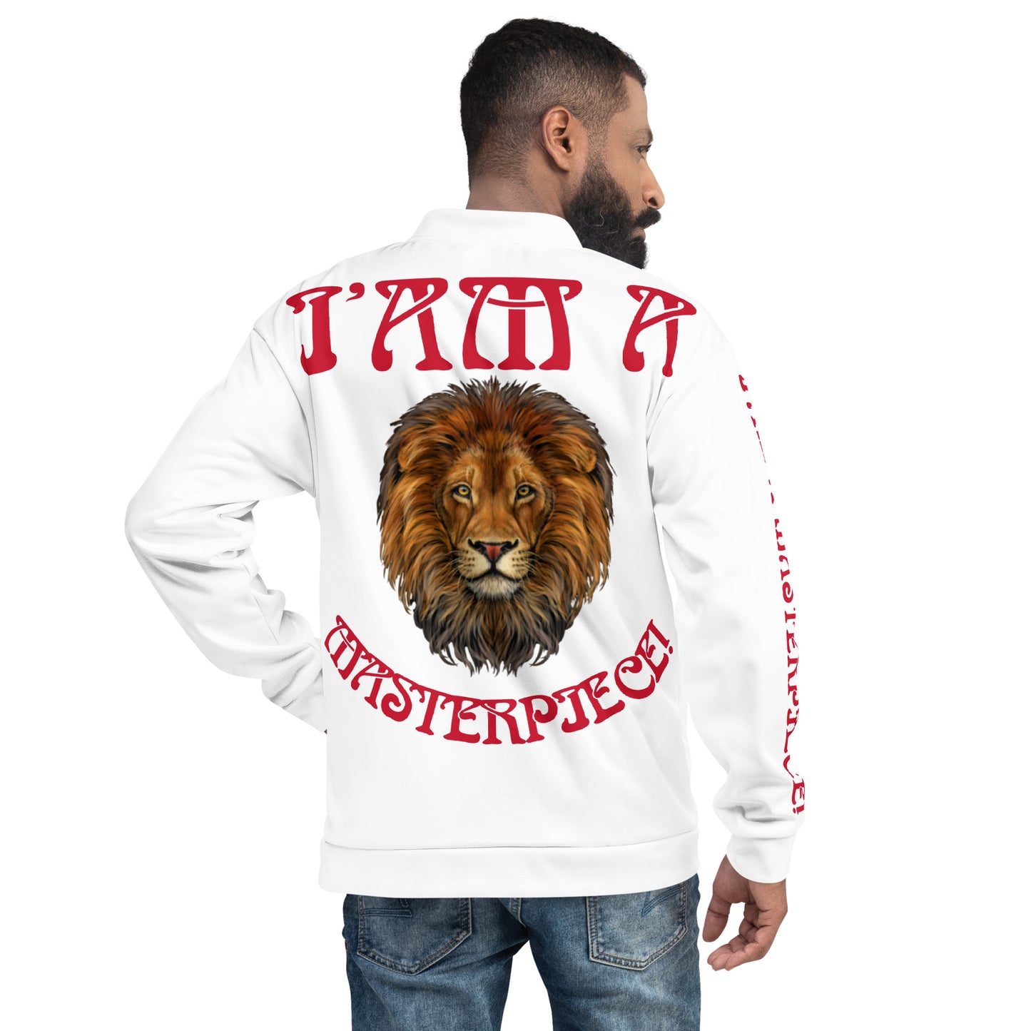 “IAM A MASTERPIECE!”White Unisex Bomber Jacket W/Red Font