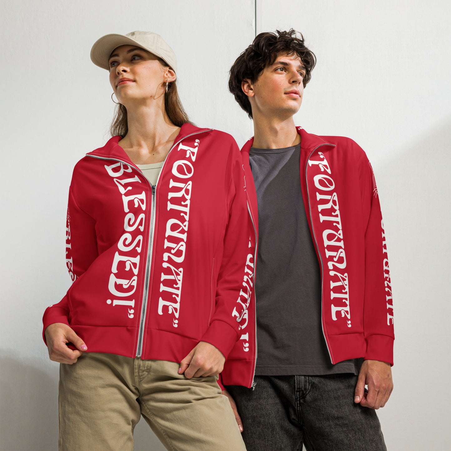 “BLESSED!,FORTUNATE”Red Unisex Track Jacket W\White Font